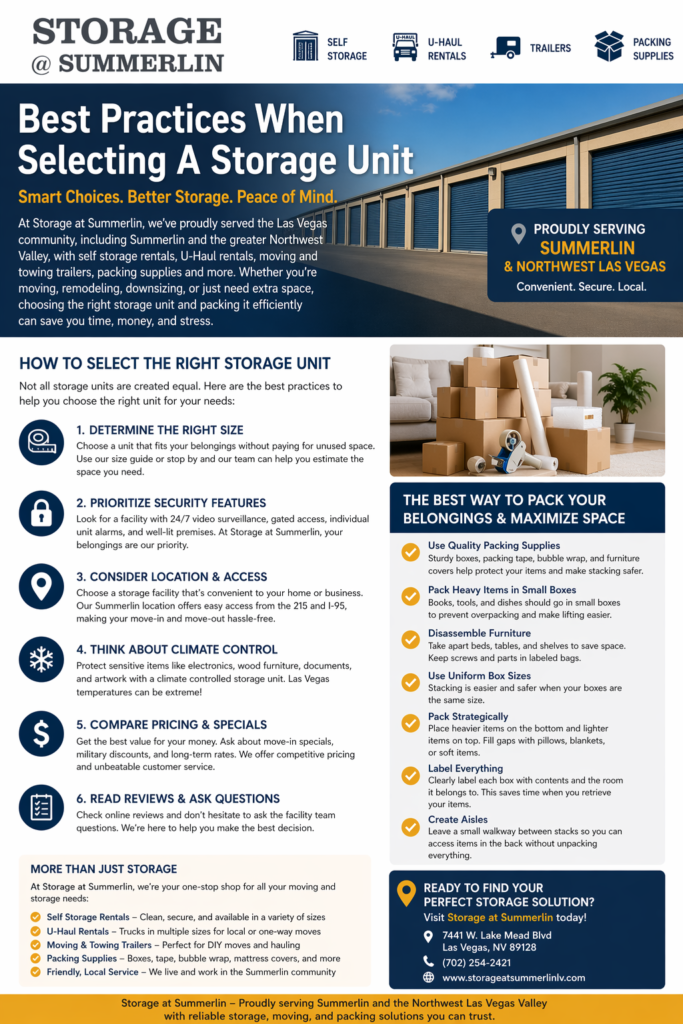 At Storage at Summerlin, we’ve helped countless customers safely store, move, and organize their belongings. Here are the best practices you should follow when selecting your self-storage unit.