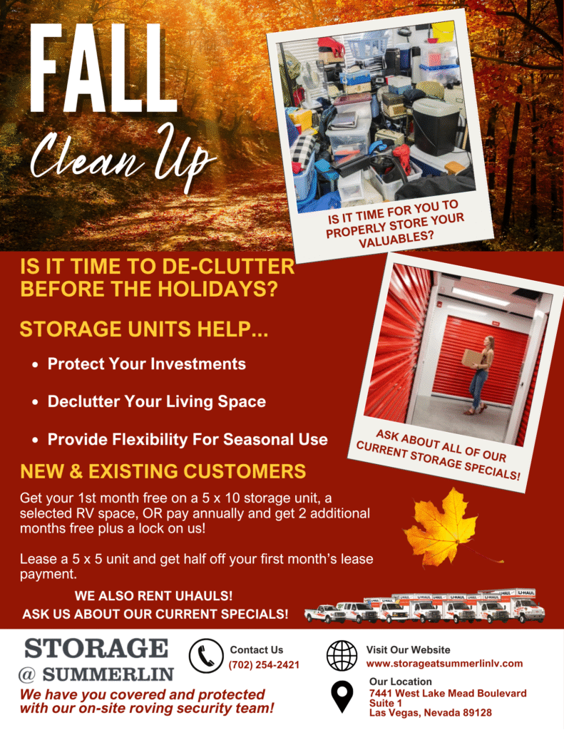 Storage At Summerlin offers some wonderful specials throughout the year! Please inquire with Vickey, our on-site manager, about our current specials and any details and restrictions!