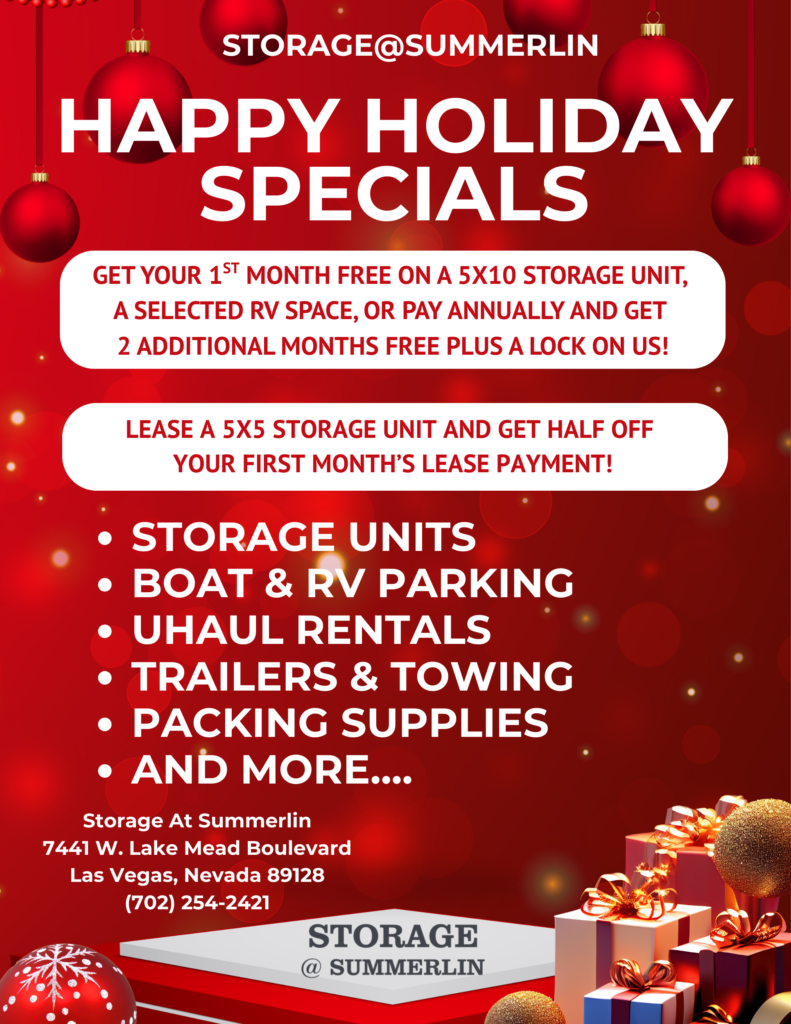 Storage At Summerlin offers some wonderful specials throughout the year! Please inquire with Vickey, our on-site manager, about our current specials and any details and restrictions!
